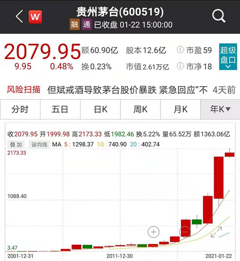 2021年,貴州茅臺繼續(xù)攀升,股價首次站上2000元,總市值達(dá)2.61萬億,比2020年貴州省GDP1.78萬億多出0.83萬億。
