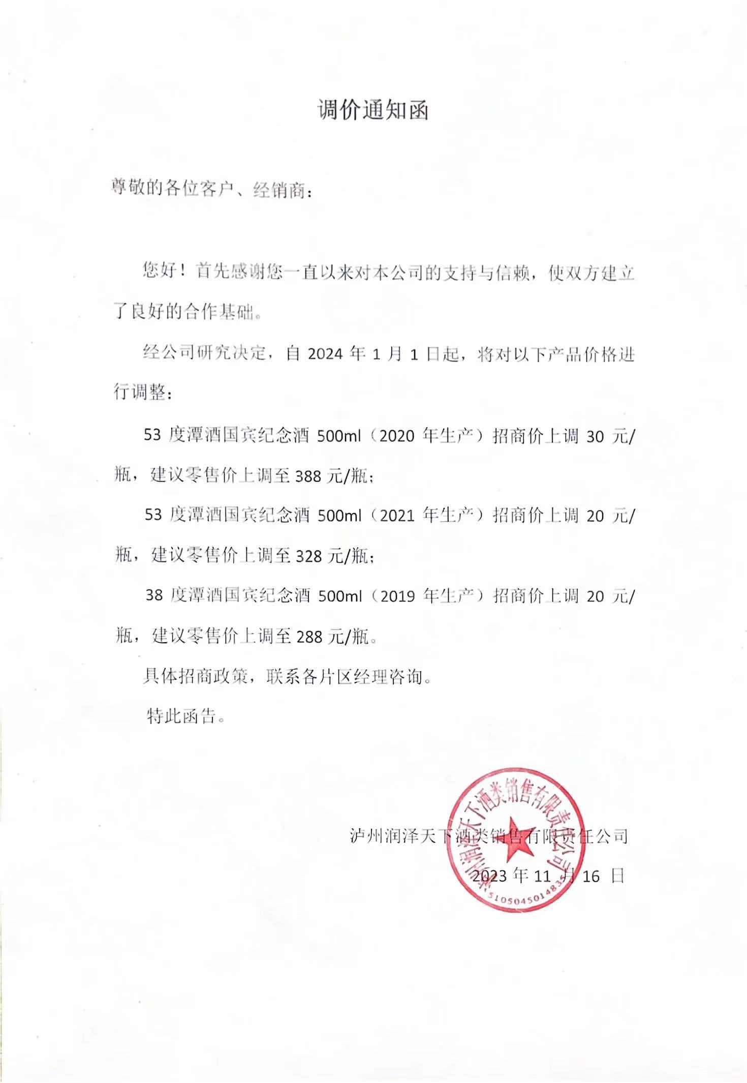 關(guān)于“潭酒國賓紀(jì)念酒”調(diào)價(jià)通知函
